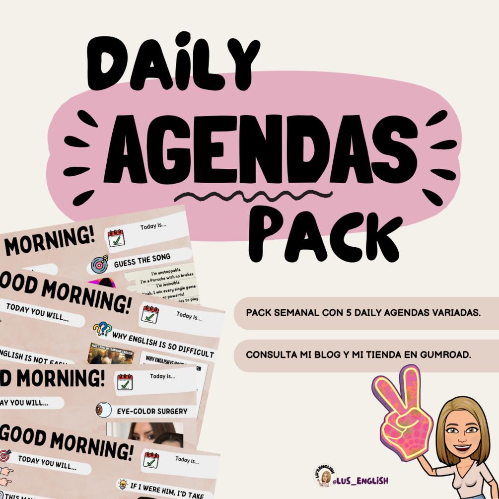 En él encontrarás 5 daily agendas diferentes para llevar al aula. Todas han sido puestas en prácticas en mis sesiones y han funcionado con éxito. Además, las podrás adaptar a cualquiera de tus niveles.